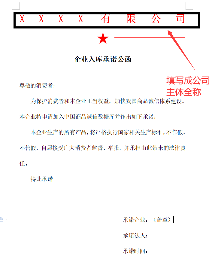 第二步:用电脑打开下载好的承诺公函,填写好公司名称,然后打印。如下图: